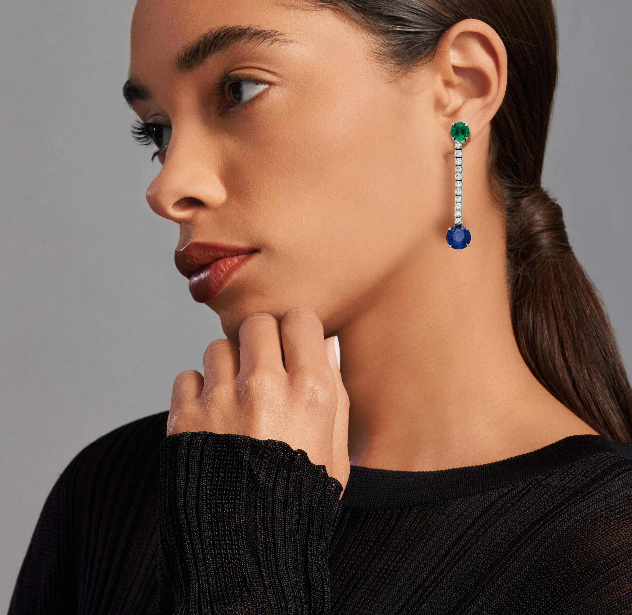 Her inaugural design – a pair of colored stone, diamond, and colored diamond “Alpha and Omega” earrings (estimated at $60,000–$80,000) – will be sold to benefit Amazon Frontlines, a non-profit organization dedicated to protecting the rights and lands of Indigenous peoples in the Amazon.