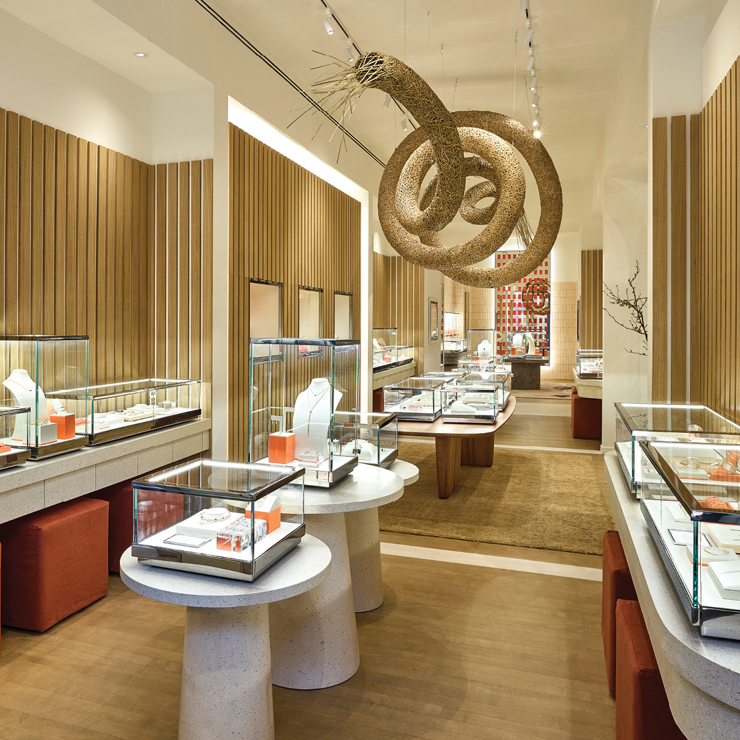 Guests are immediately greeted by signature brand motifs: a giant gold-finished Spear bracelet hanging from the ceiling, a 25-foot sculpture crafted by Balinese bamboo master Gustin Ngurah Udianata.